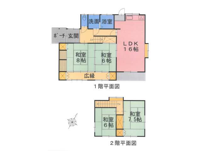 | 詳細間取 | 4LDK (1階:和8帖×1、1階:和6帖×1、2階:和6帖×1、2階:和7.5帖×1、1階:LDK16帖) | ||